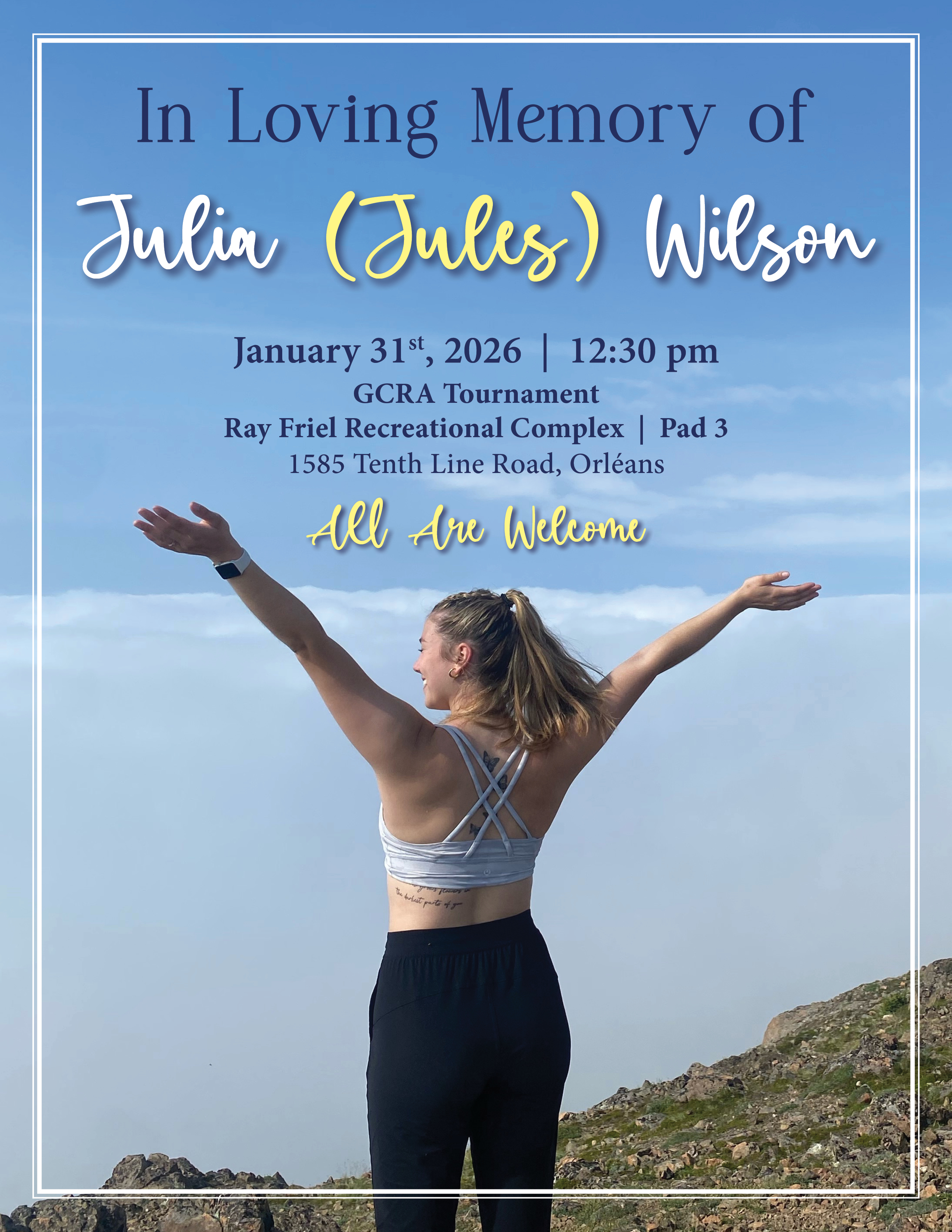 On January 31st, during the GCRA Tournament at the Ray Friel Recreational Complex, we will pause for a special memorial tribute to honour and remember Julia “Jules” Wilson — a young woman whose life, love, and spirit continue to inspire our entire community.